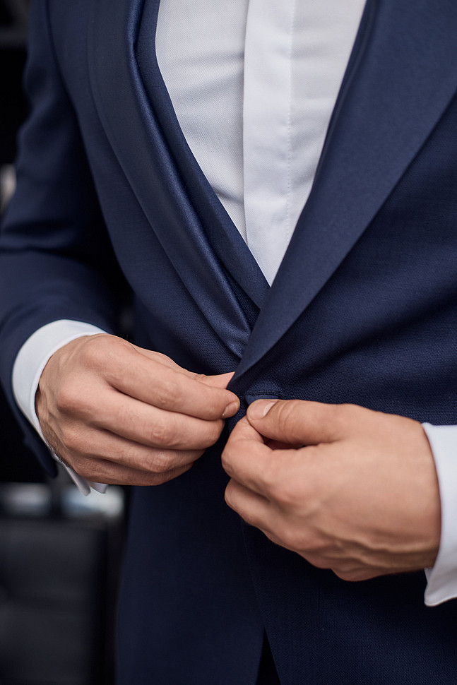 Смокинг отличается от обычного костюма тем, что у него лацканы выполнены из шелка или атласа и имеют специальную форму – "ласточкин хвост". Это придает образу особую элегантность. Лацканы костюмного мужского пиджака выполнены из той же ткани, что и костюм.